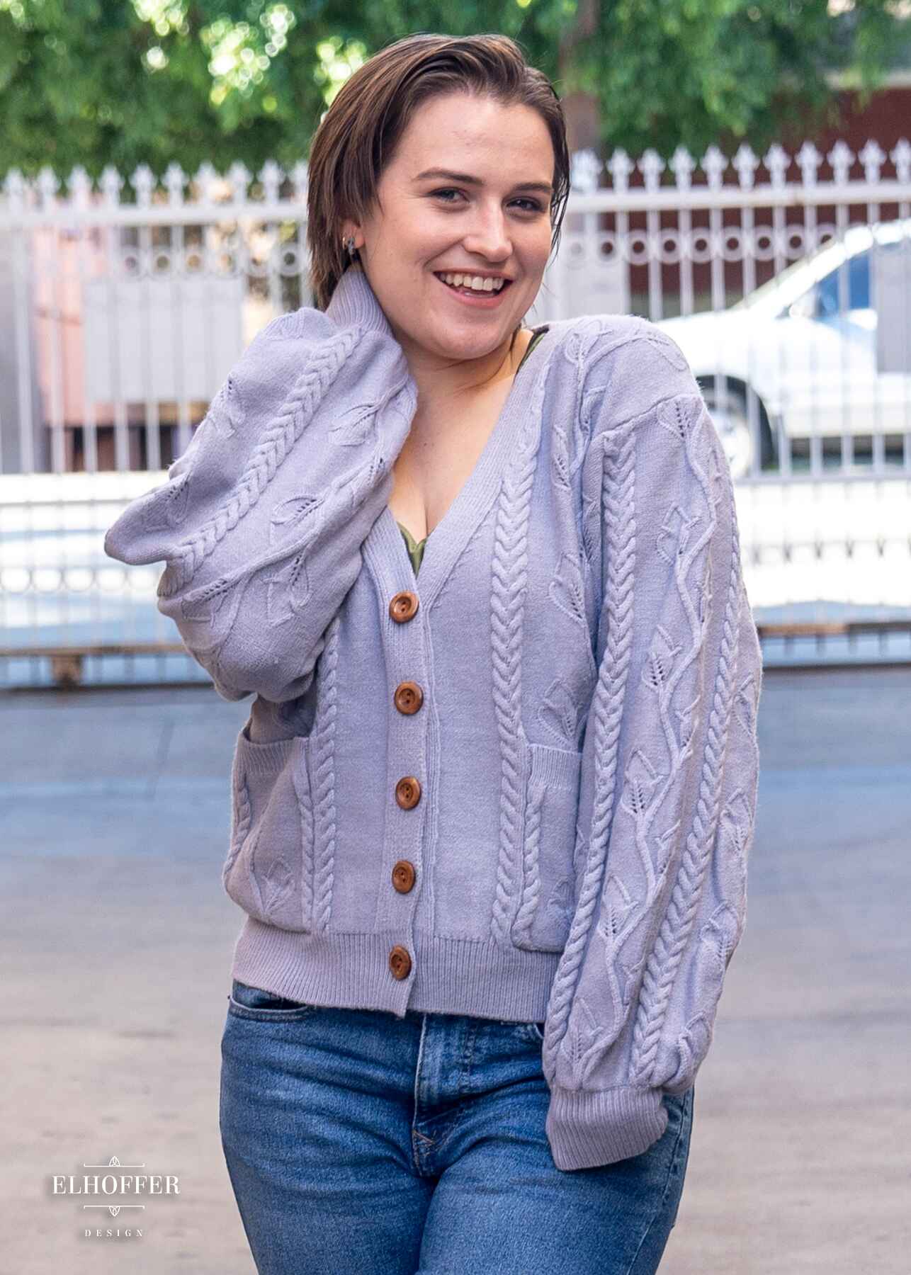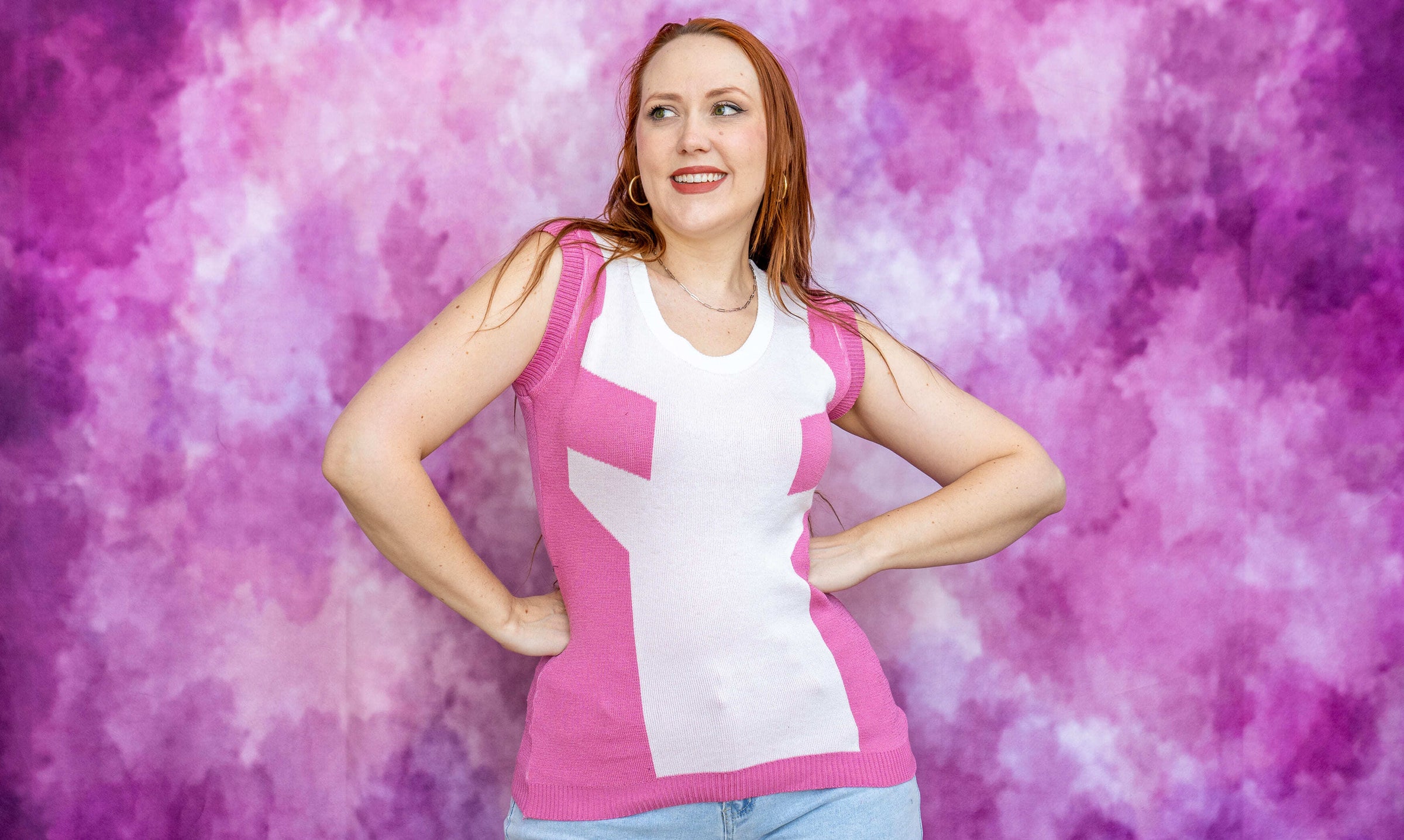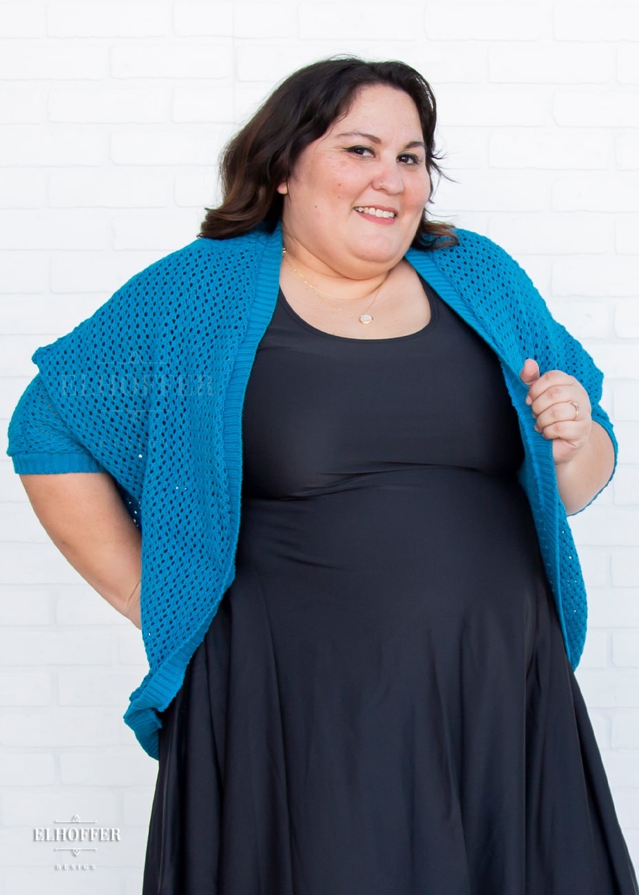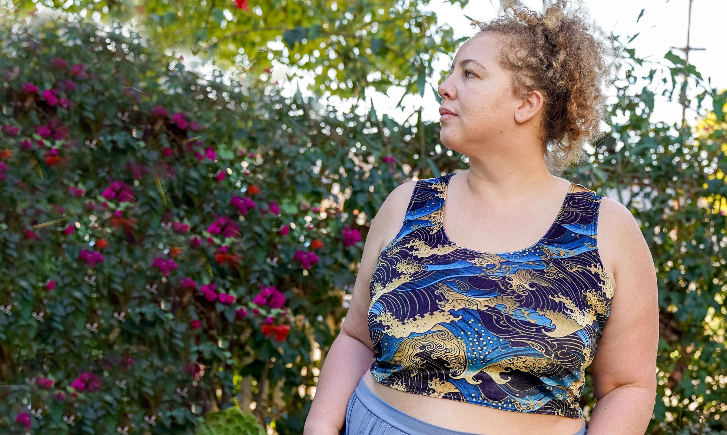 Amanda is modeling the Sample M/L. She tends to wear a M or L in our pieces and has a 41" Bust, 33" Waist, 40" Hip, and is 5'1".