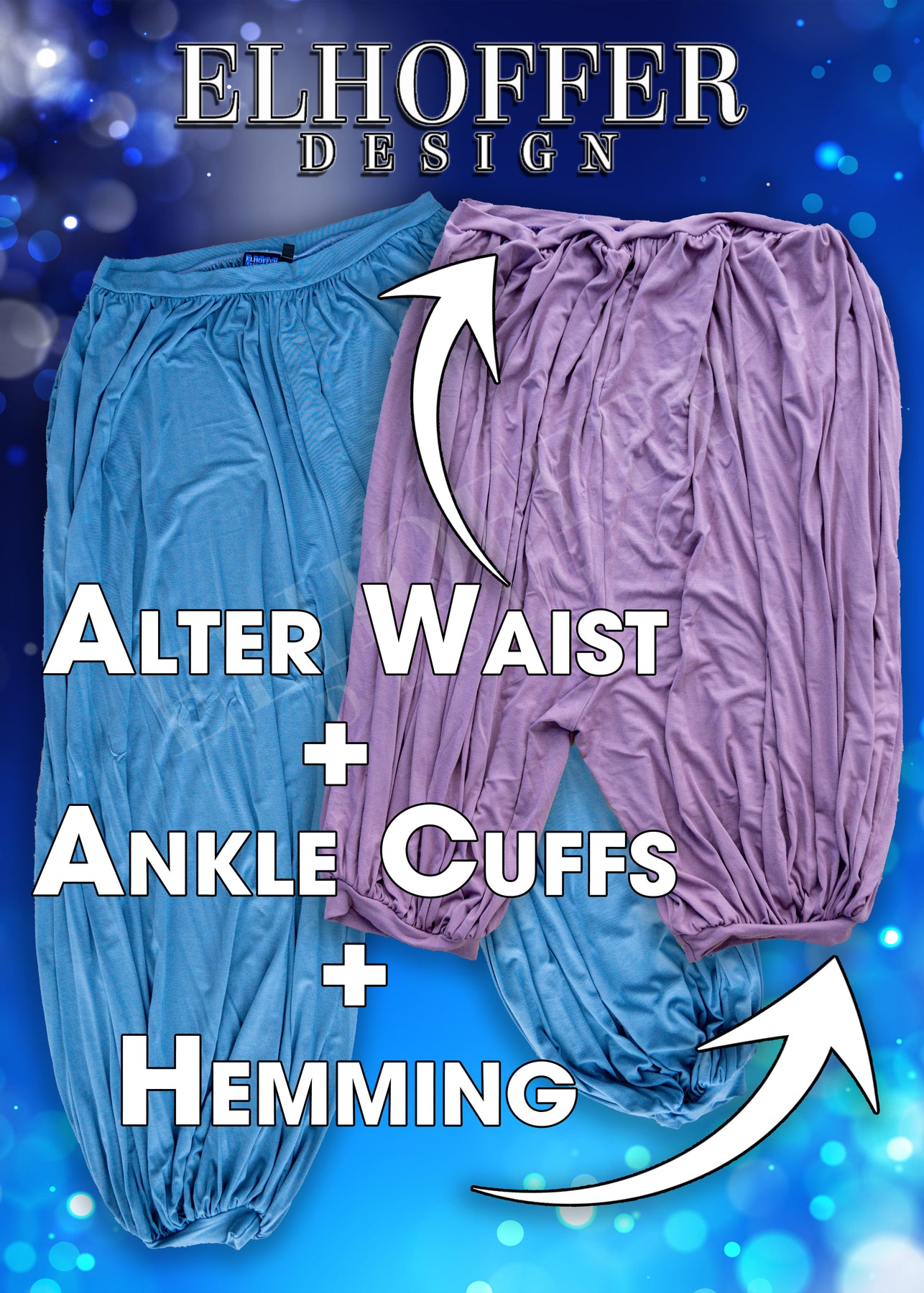 On Yasmin Pants we can reduce the waistband size to make the pant smaller. We offer just the waistband reduction, or we can reduce the waistband and also reduce the two ankle bands as a package. We also can hem the pants and either put the lower bands back on OR remove them entirely. All options are listed below!