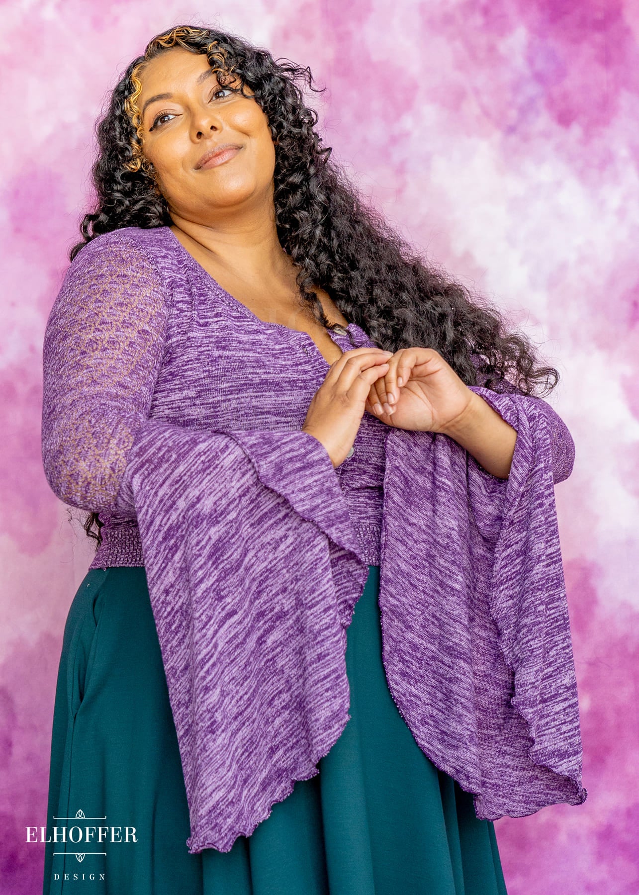 Bernadette is modeling the Production Small. She has a 40” Bust, 36.5” Waist, 43” Hips, and is 5’6”. She generally wears a L in our pieces.