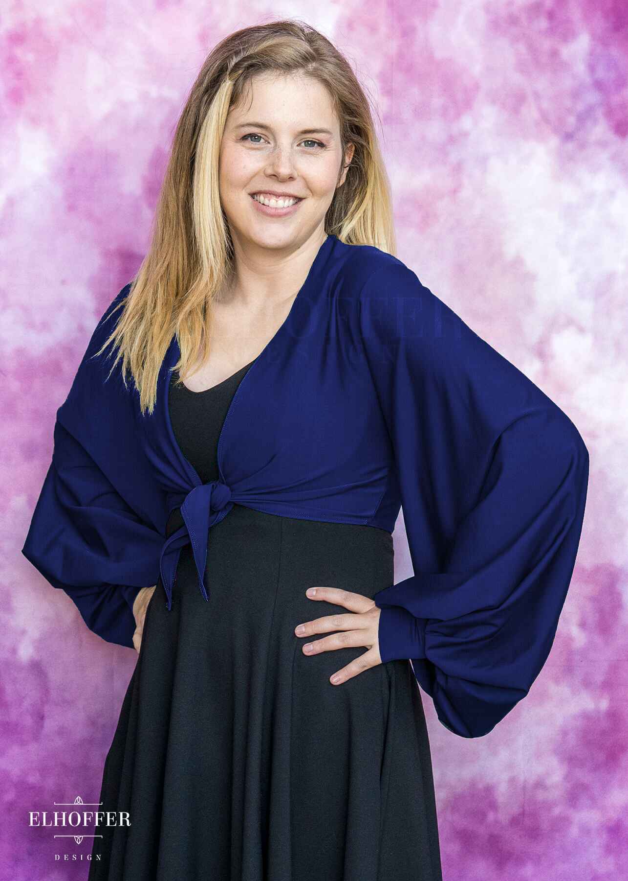 Add dramatic bishop sleeves to any look with this simple to layer top! It wraps in the front for a cute finish and could be worn over dresses or tops, or even just styled on its own for a sexy look with denim or  a skirt!