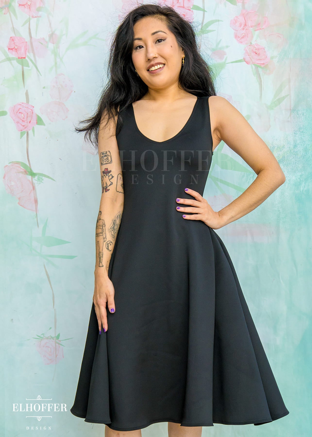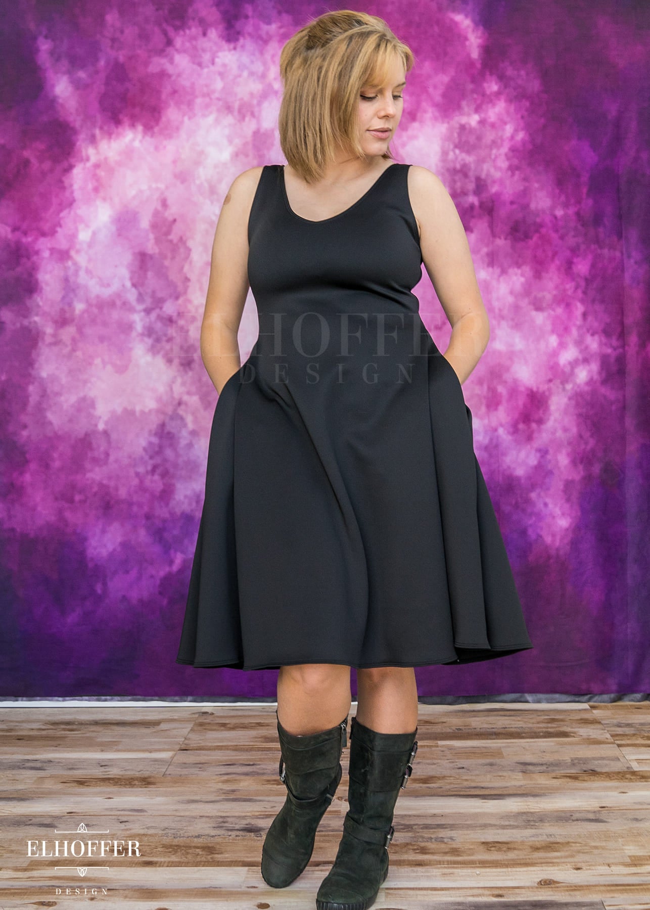 A magically stretchy & soft scuba pullover dress designed for comfort and class featuring a reversible neckline for a Deep V or a High Boatneck. Fully equipped with pockets!