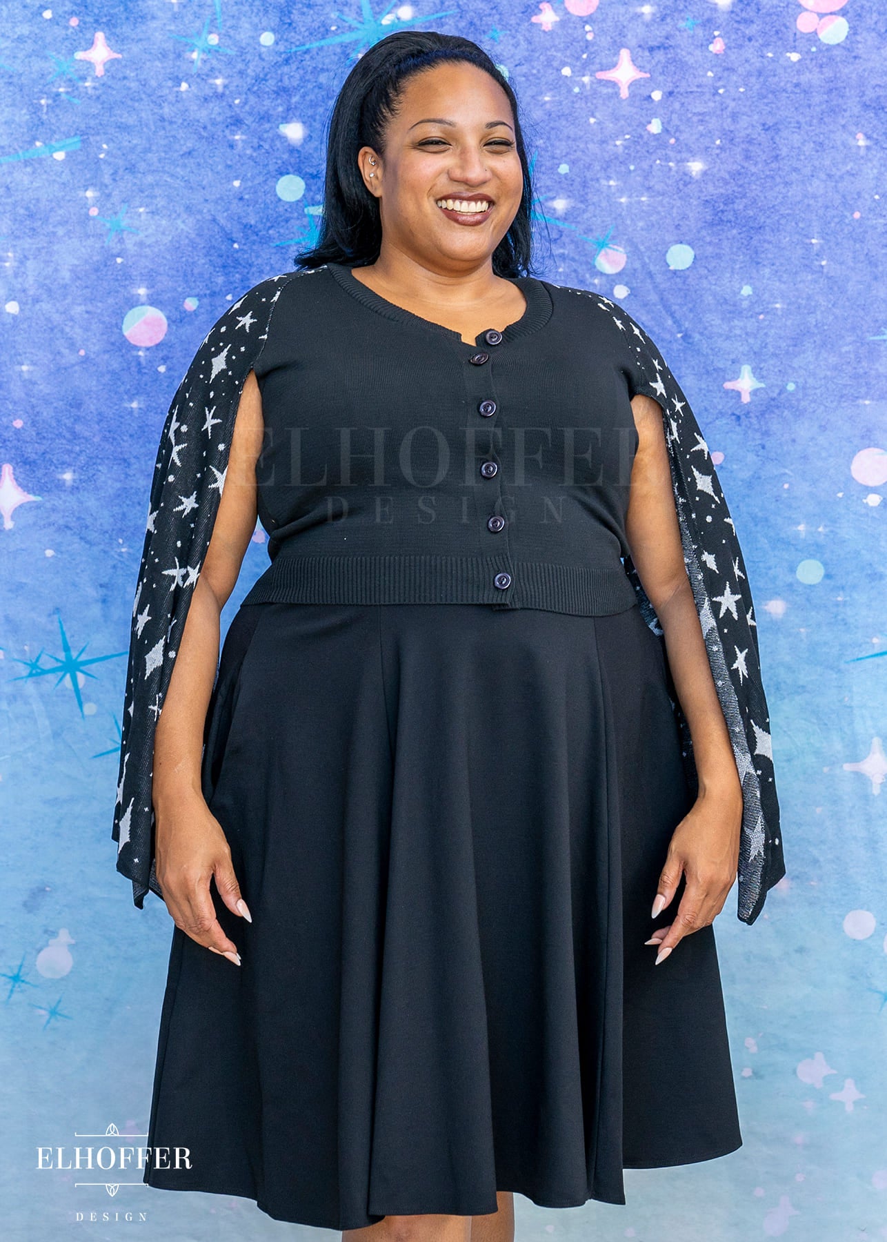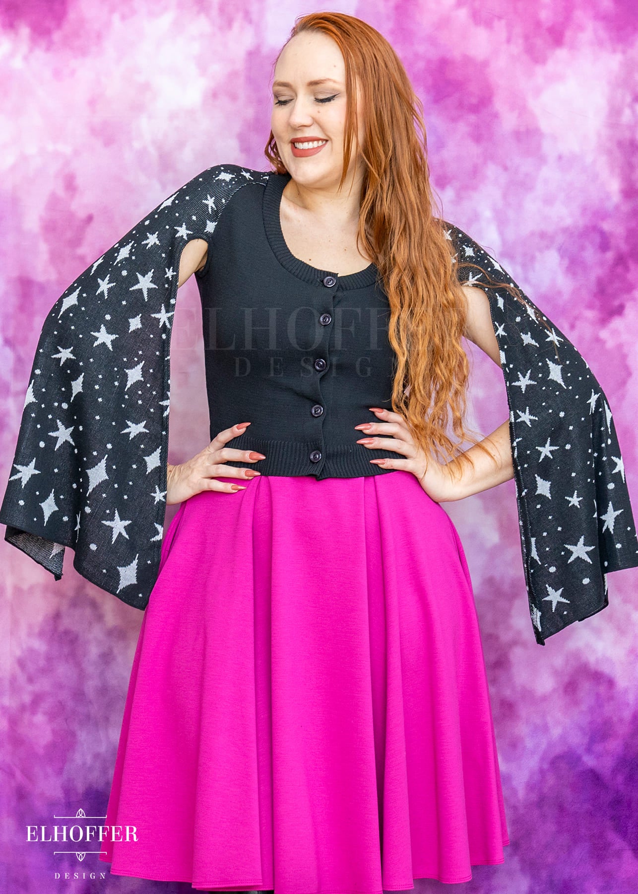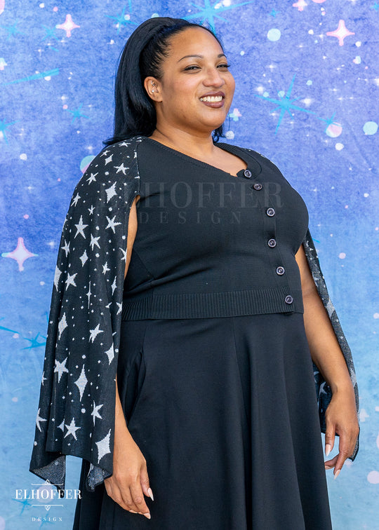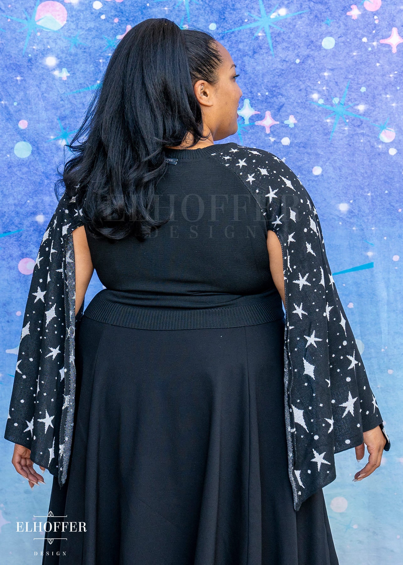 Bernadette is modeling the Sample XL but would've been better in the Large. She has a 40” Bust, 36.5” Waist, 43” Hips, and is 5’6”. She generally wears a L in our pieces.
