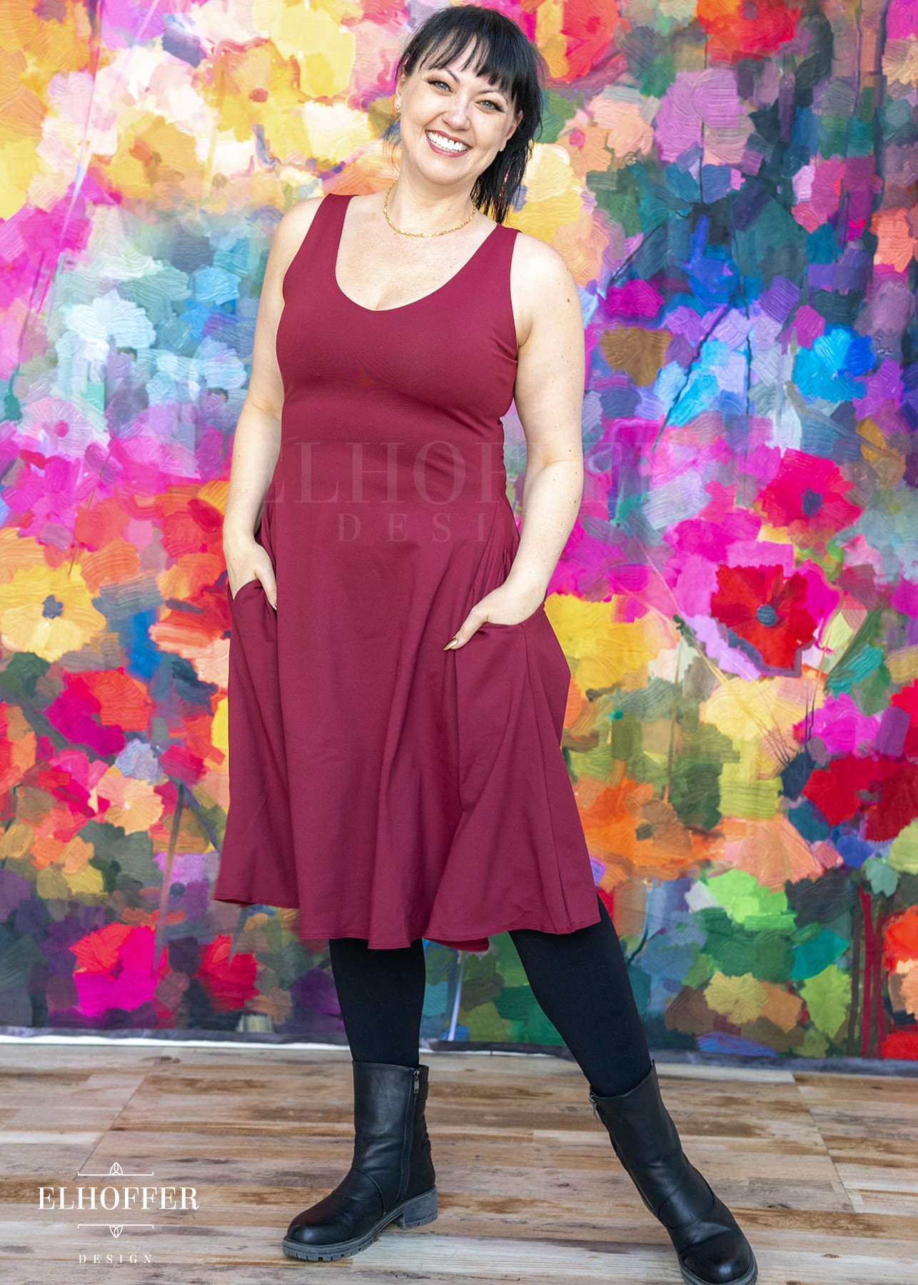 A magically stretchy & soft Spandex pullover dress designed for comfort and class featuring a reversible neckline for a Deep V or a High Boatneck. Fully equipped with pockets!