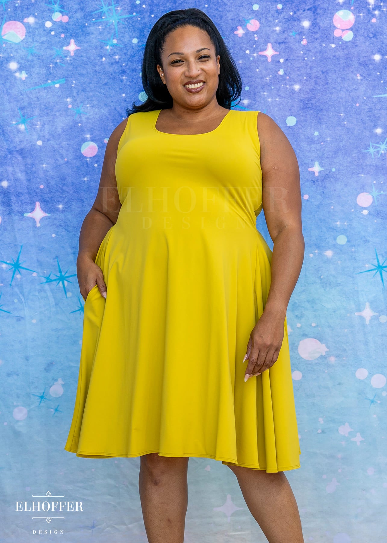 A magically stretchy & soft Spandex pullover dress designed for comfort and class with a scoop neck front neckline. Fully equipped with pockets!