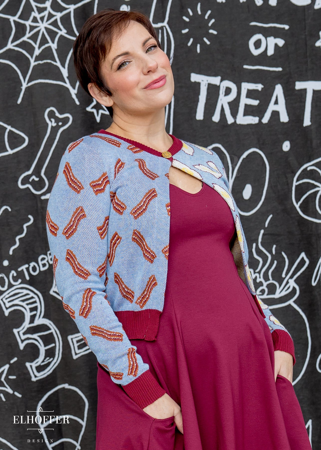 Whitney has a 37" Bust, 28" Waist, 36" Hip, and is 5'3". Whitney is modeling the Production Medium.