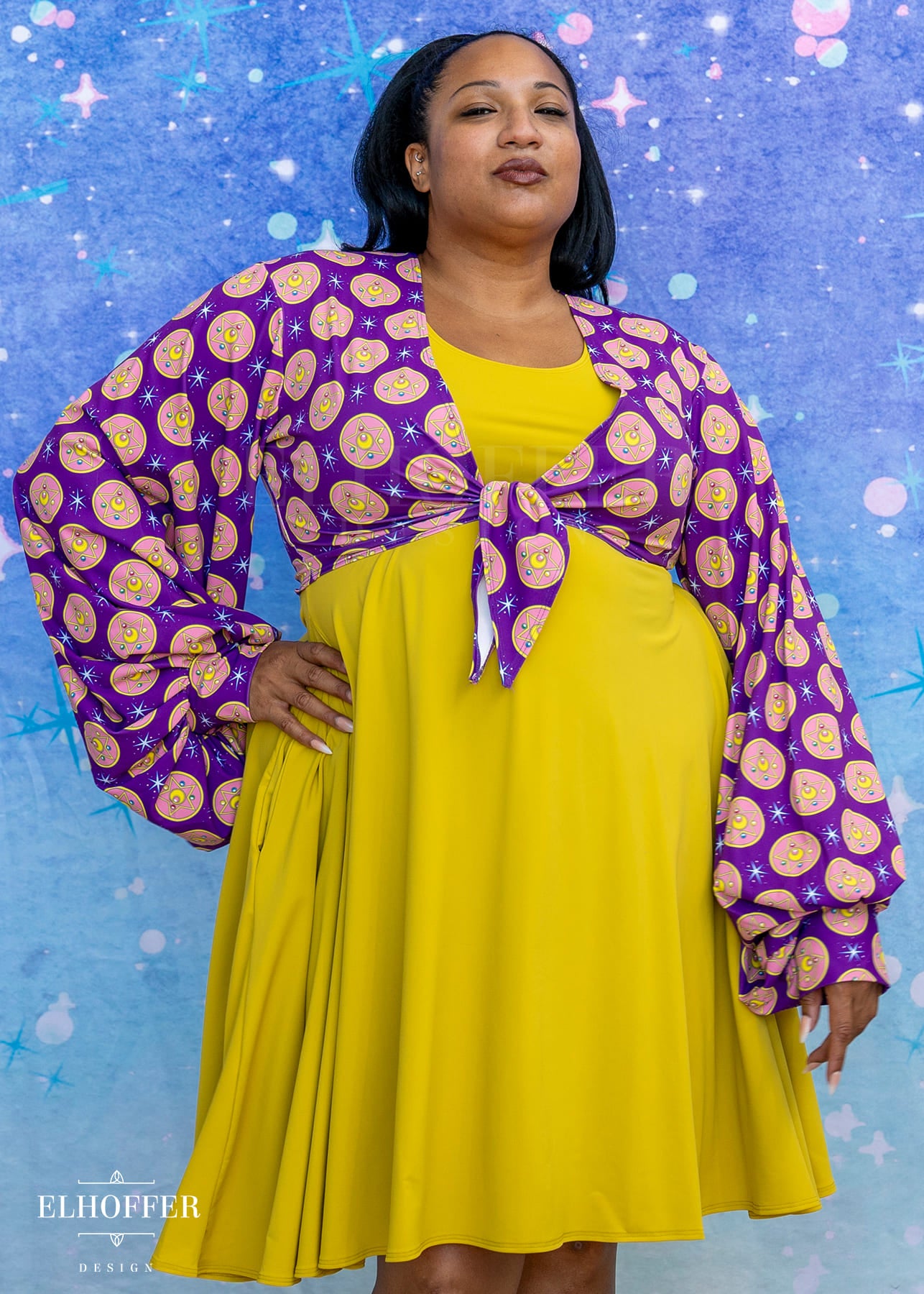 Add dramatic bishop sleeves to any look with this simple to layer top! It wraps in the front for a cute finish and could be worn over dresses or tops, or even just styled on its own for a sexy look with denim or a skirt!