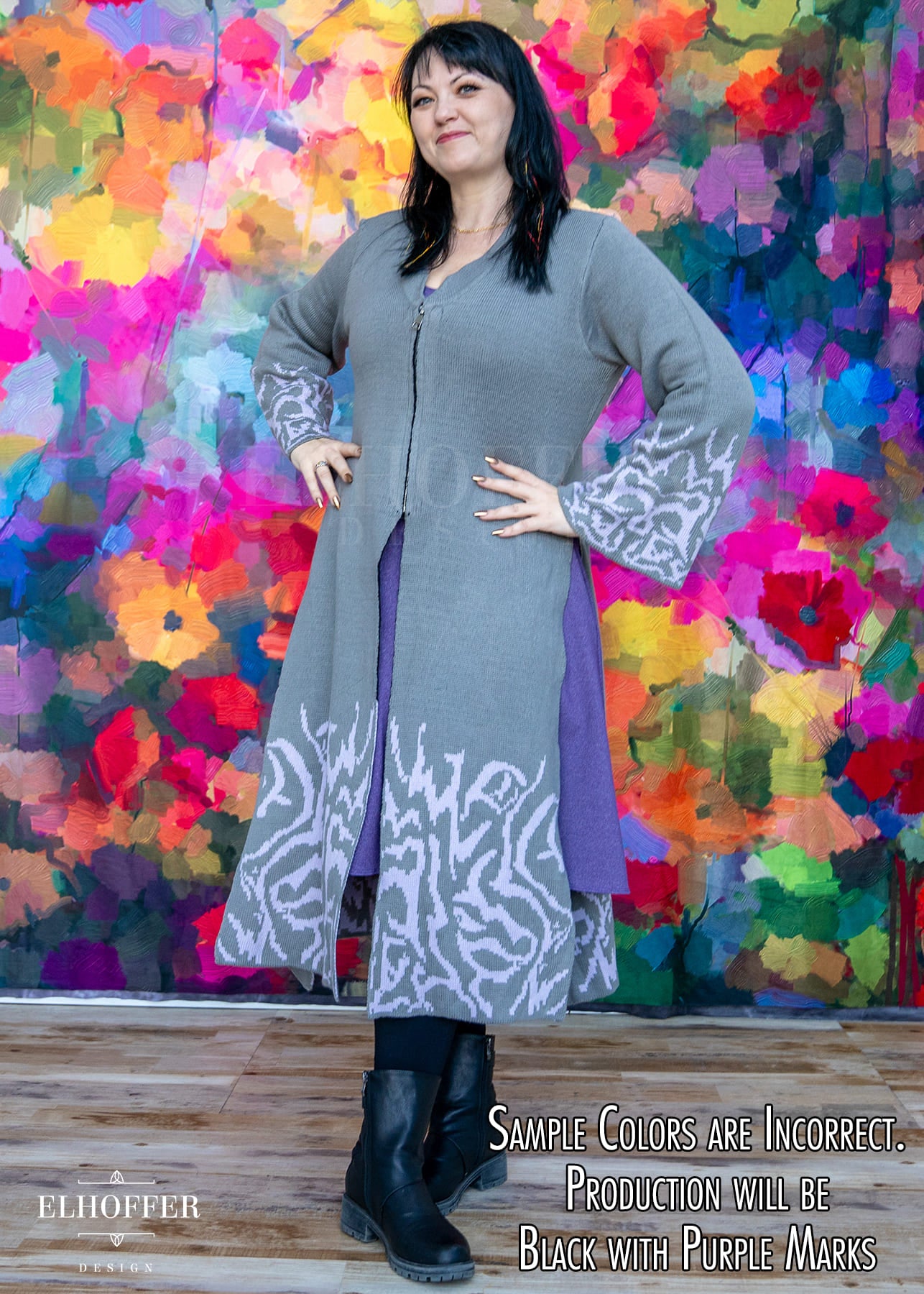 I'm thе only one who'll love your sins, feel the way this soft robe feels on your skin. You'll be asking to get the mic a little higher in this knit duster with split sides and back, perfect for drama when performing with your band or fighting demon hunters. Inspired by the black hanbok worn by Jeoseung Saja, this robe will be black in production (our sample was grey, sadly) with purple marks along the sleeve and hem for a gorgeous pop of color. We did not have the energy to edit all pics in this piece to make them all the correct black and purple, as our souls have been drained by Gwi Ma but hopefully you can fill our energy back up by grabbing this stunning piece!