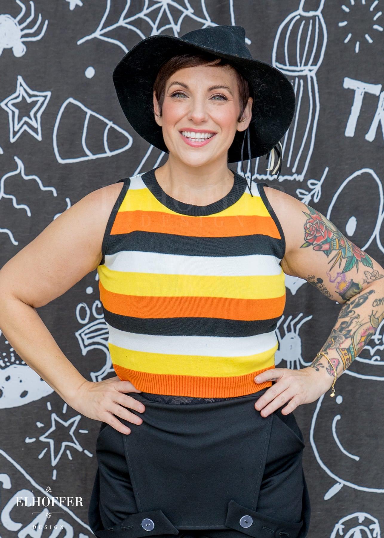 We will forever stand by the statement that crop tops are for everybody and every body. With angled armholes and a close jewel neckline, this knit, stretchy top is perfect over our high waisted skirts and pants!