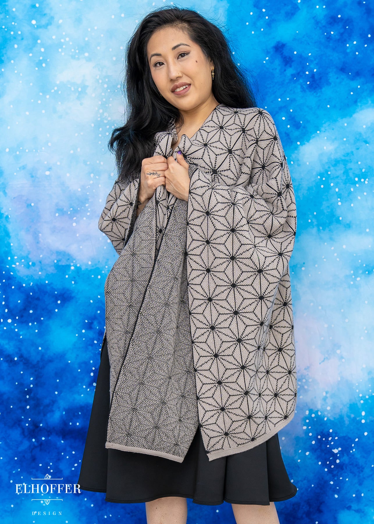Bernadette is modeling the Production One Size. She has a 40” Bust, 36.5” Waist, 43” Hips, and is 5’6”. She generally wears a L in our pieces.