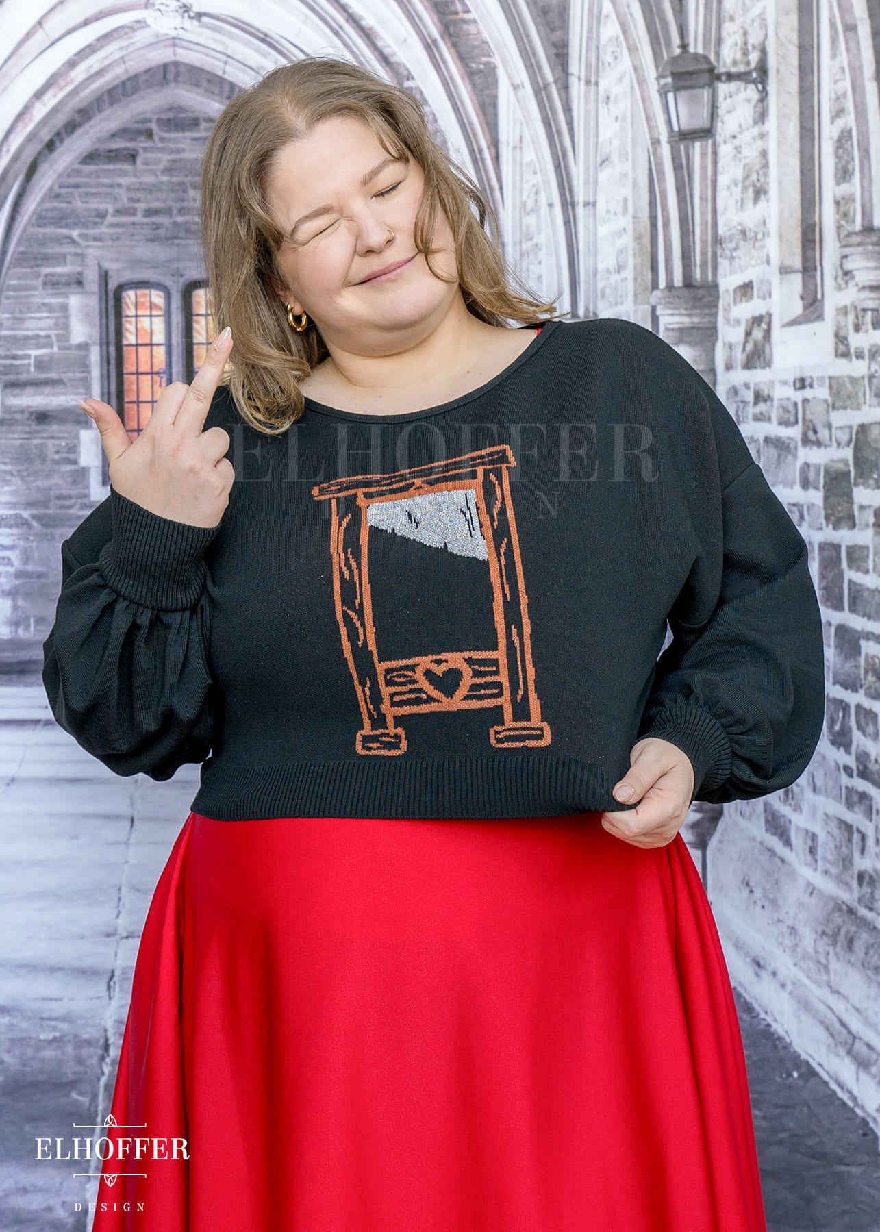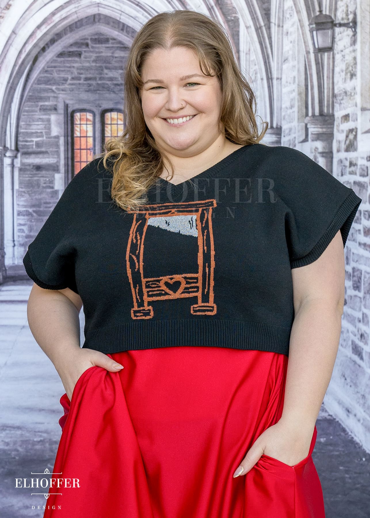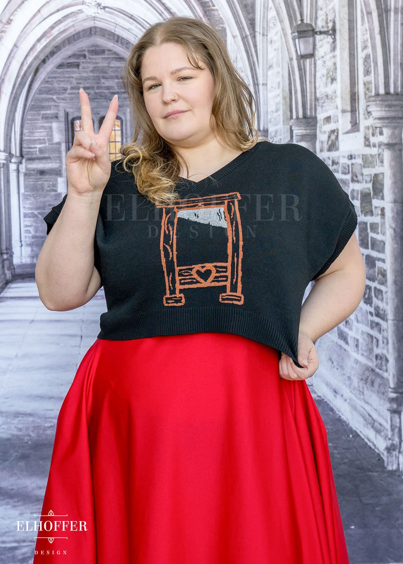Sarah is modeling the Production XL/2XL. She has a 48” Bust, 40” Waist, 51” Hips, and is 5’6”. She tends to wear our XLs.