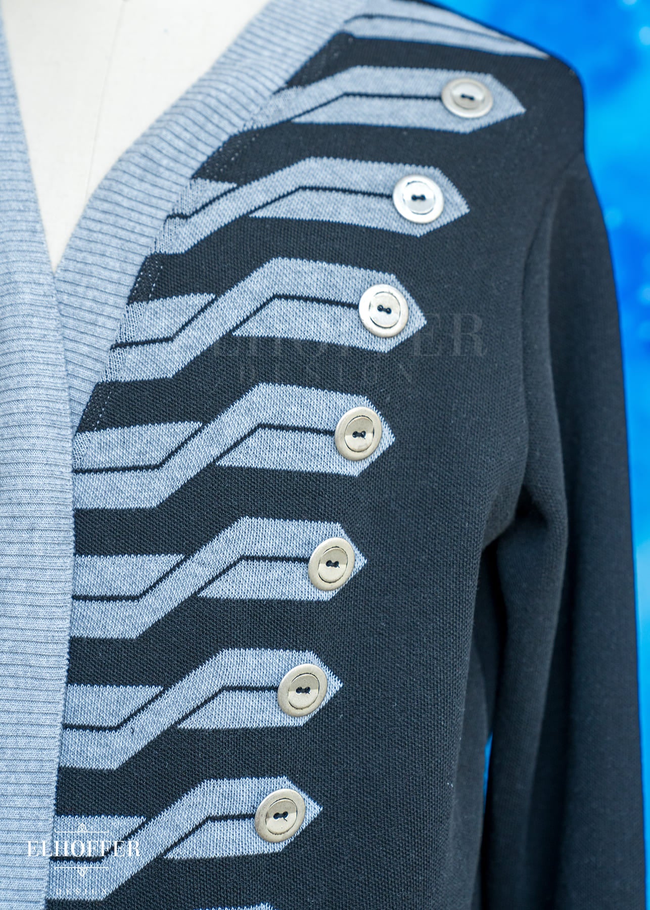 This is designed for a more feminine body to have an oversize fit, and for a more masculine body to be slightly fitted in the arms while still relaxed fit in the body. Masculine bodies can order their usual sweater size for a slim look. Feminine bodies can order their standard Elhoffer Design size for an oversized look, or a size down for a more fitted look (though it is still a more relaxed fit due to the shoulders and chest size!)