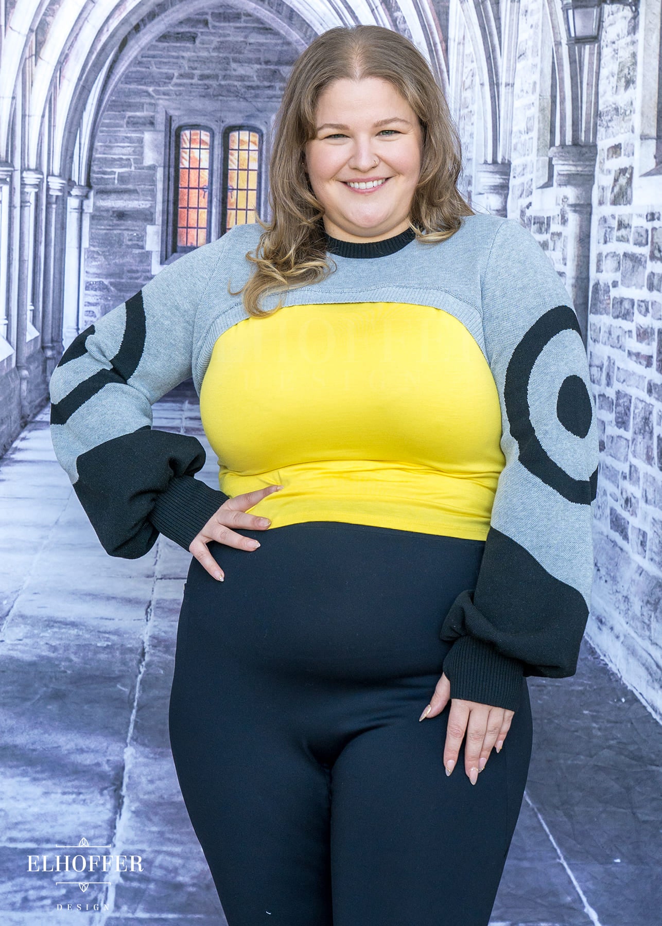 Sarah is modeling the Production L (XL-3XL). She has a 48” Bust, 40” Waist, 51” Hips, and is 5’6”. She tends to wear our XLs.