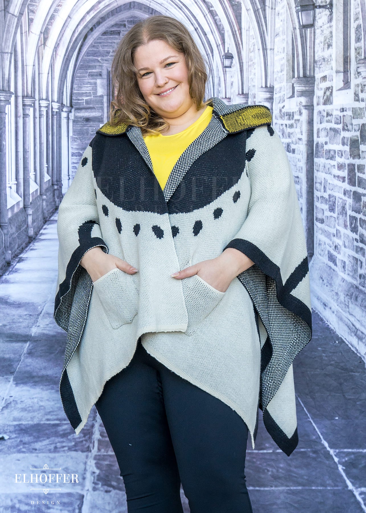 Bernadette is modeling the Sample One Size. She has a 40” Bust, 35” Waist, 41” Hips, and is 5’6”.