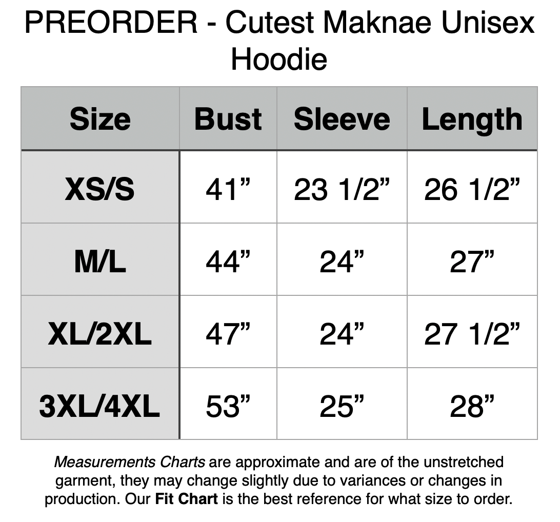 Preorder Cutest Maknae Unisex Hoodie. XS/S - 41” Bust, 23.5” Sleeve, 26.5” Length. M/L - 44” Bust, 24” Sleeve, 27” Length. XL/2XL - 47” Bust, 24” Sleeve, 27.5” Length. 3XL/4XL - 53” Bust, 25” Sleeve, 28” Length.