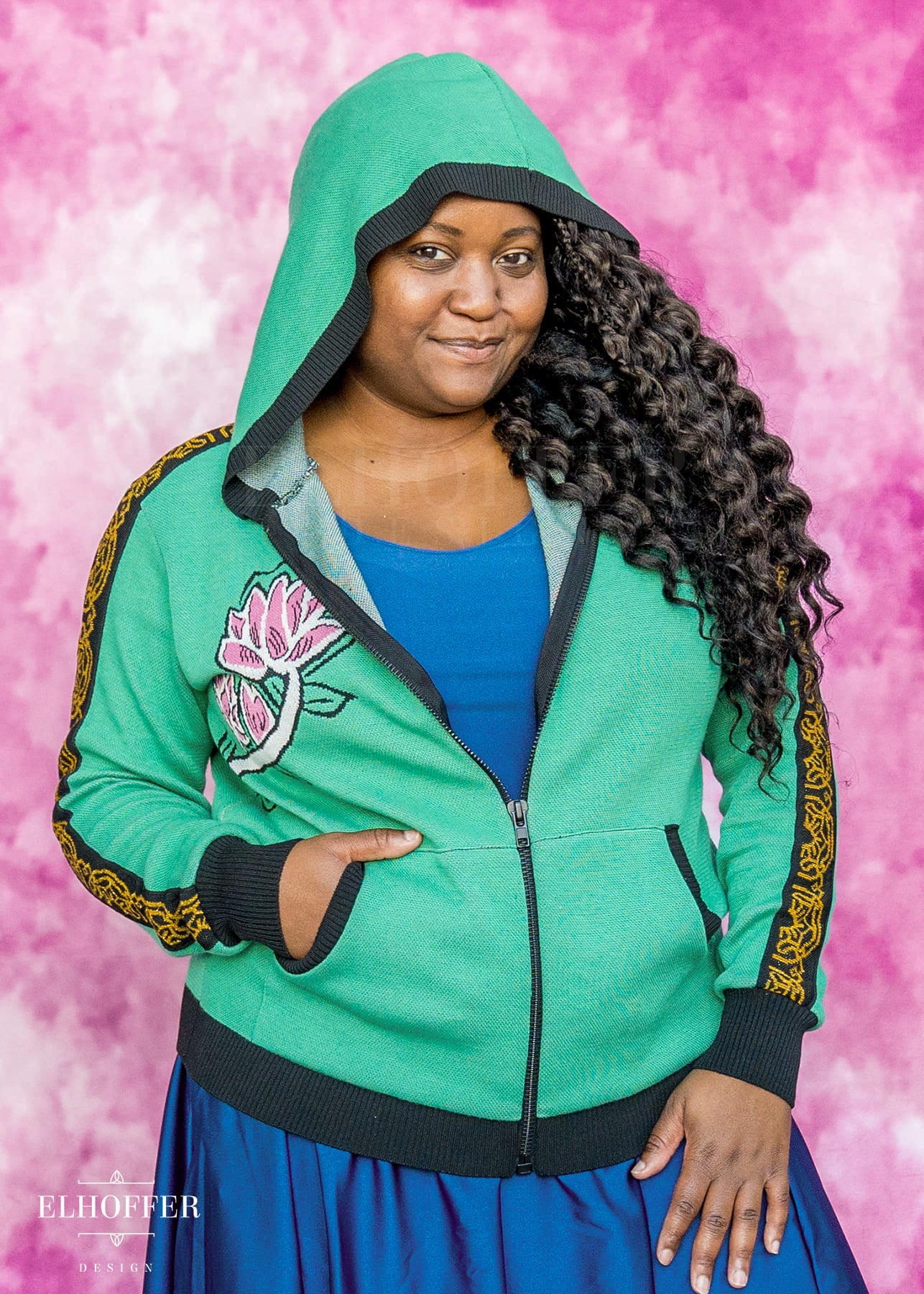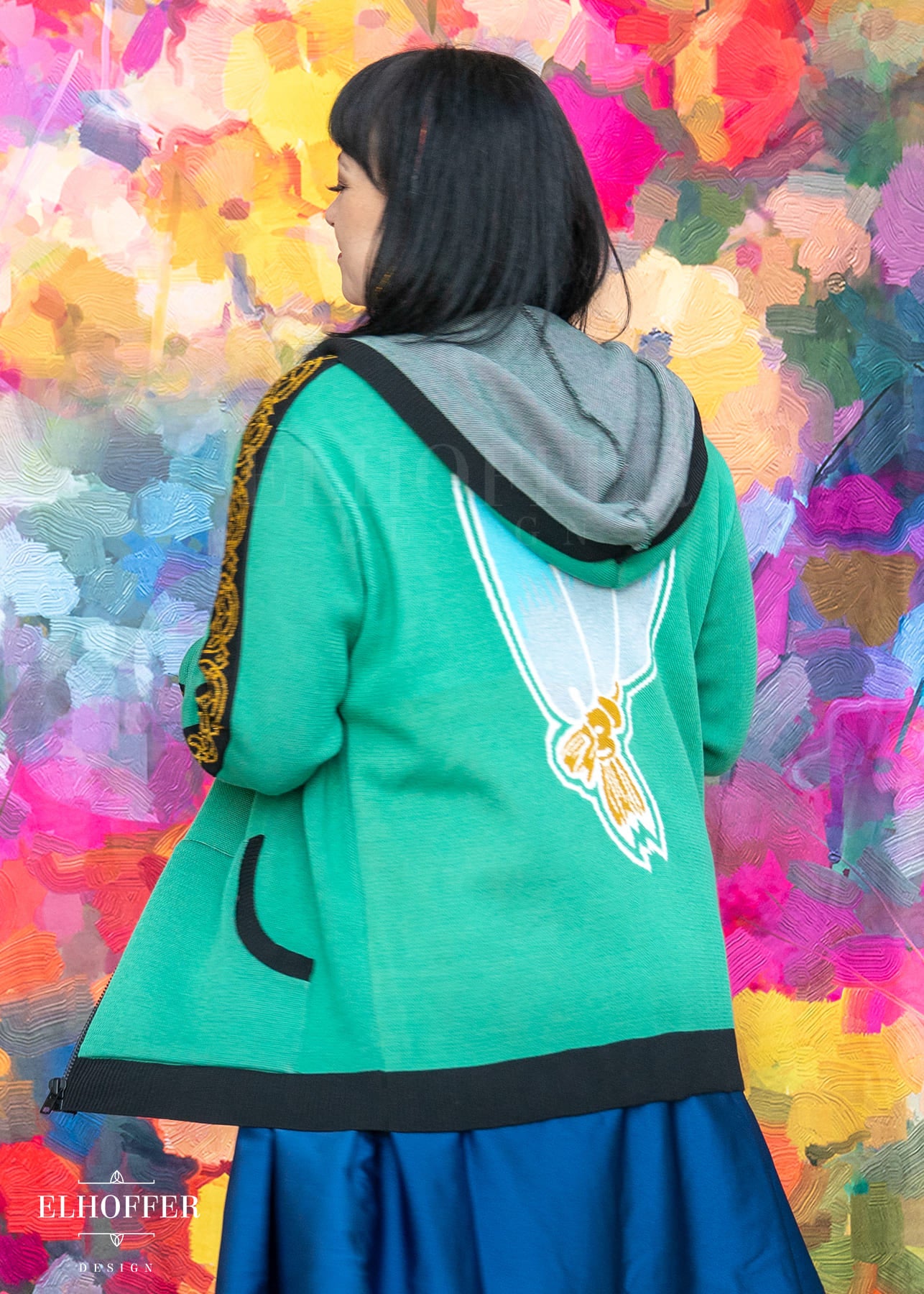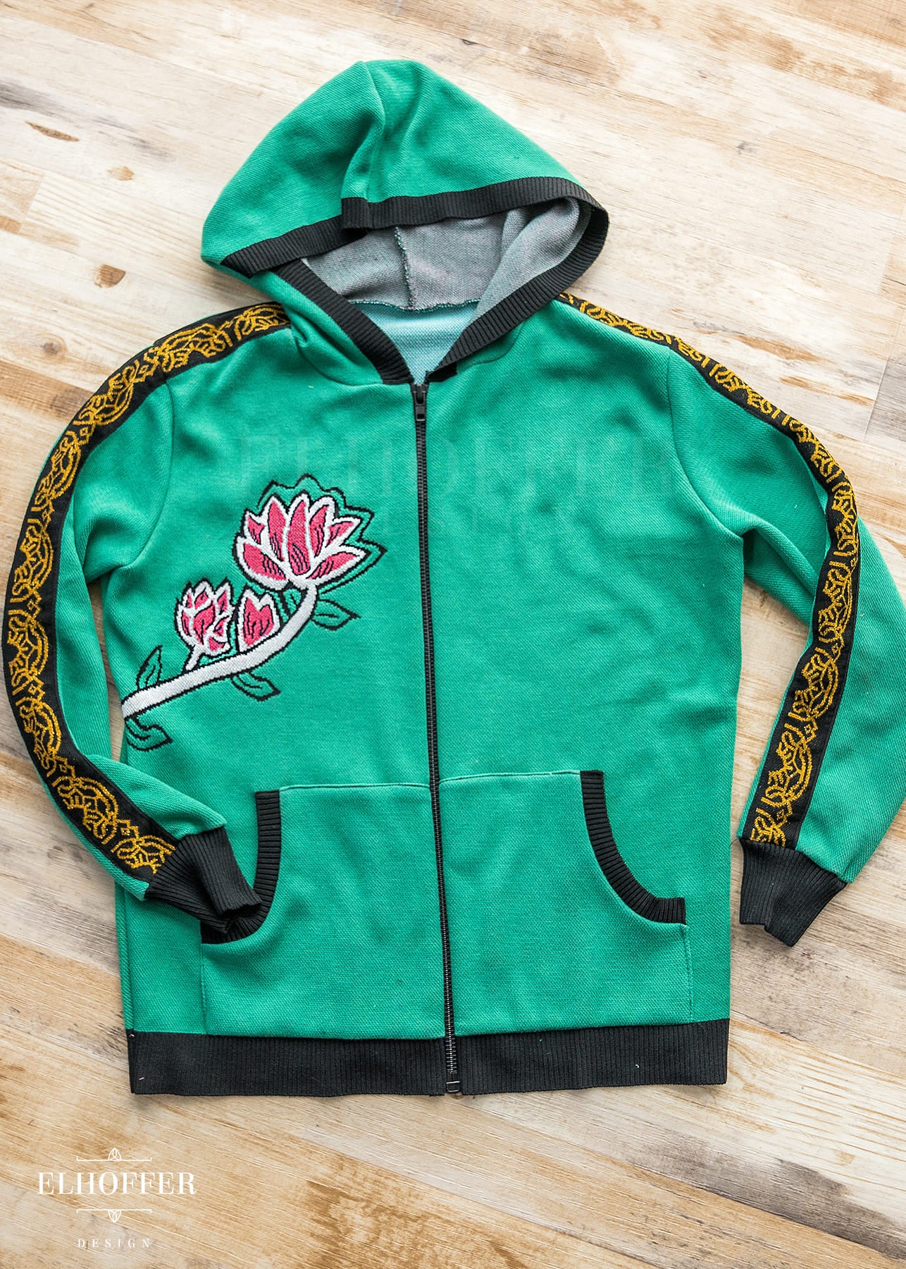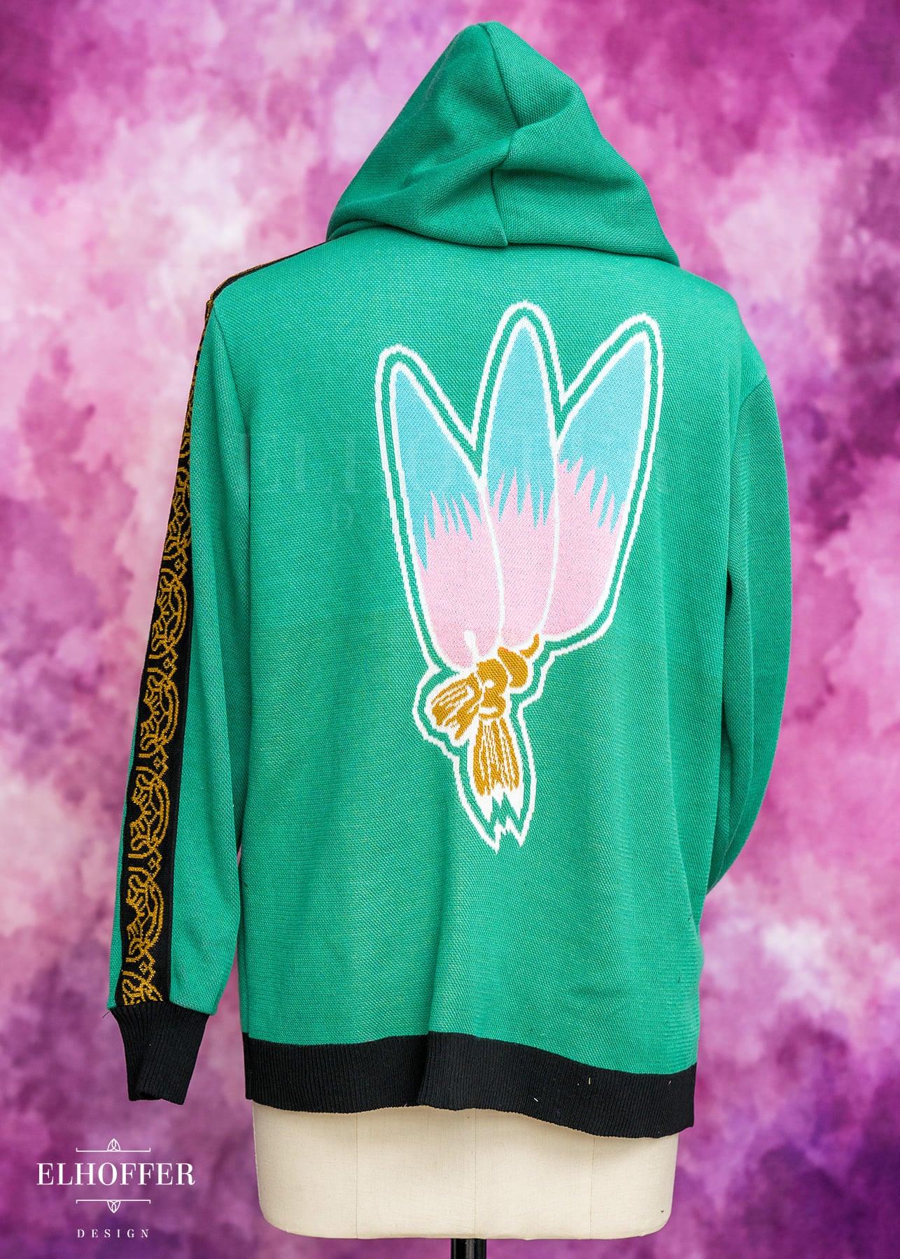 Our sample had the wrong shade of pink used in the flower, the final production will be a magenta instead of a light pink. And the wrong color at the base of shin-kal blades, sample is grey and we are changing it to light pink. We also are working on adding a yellow norigae knit art into the left pocket art.
