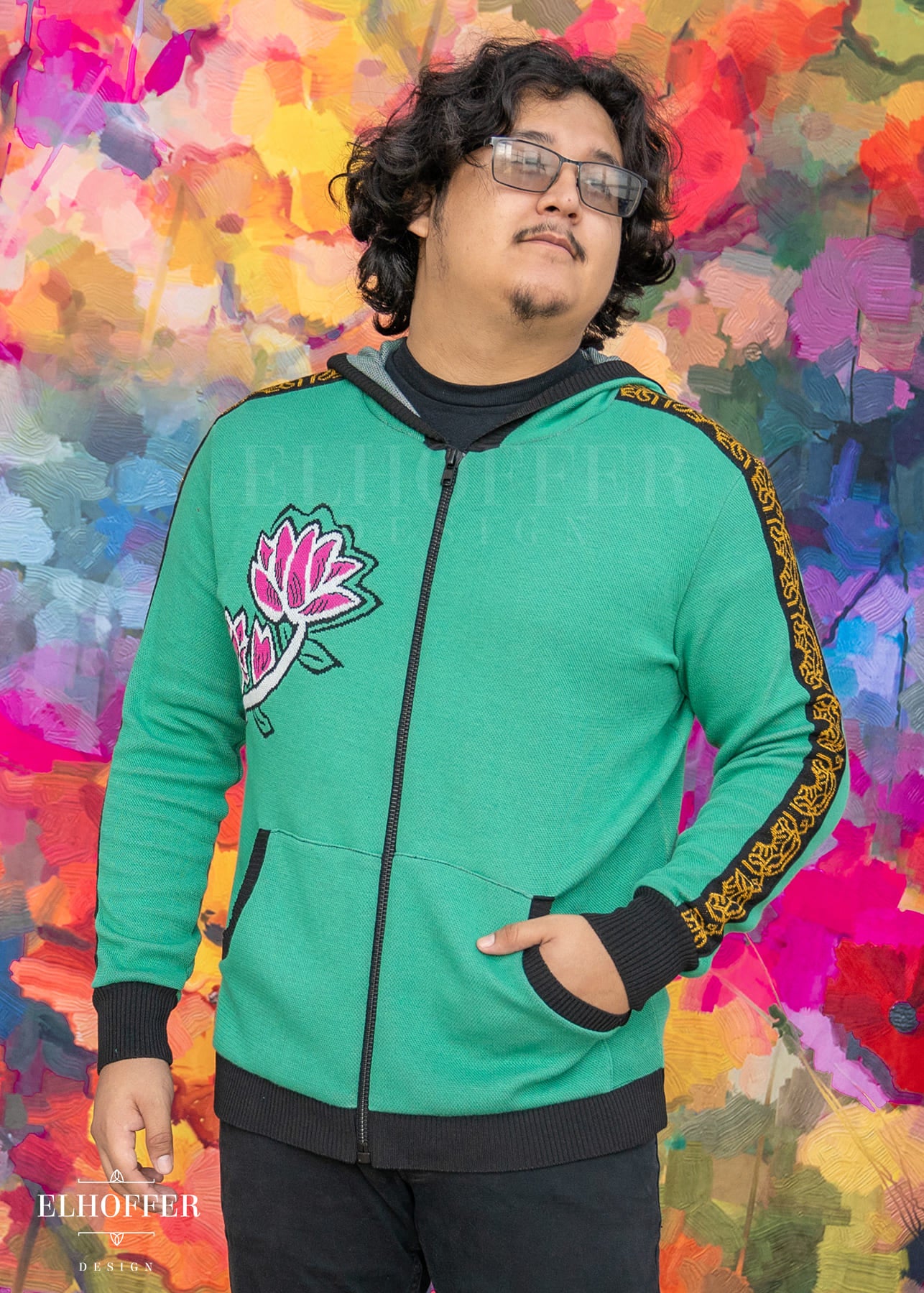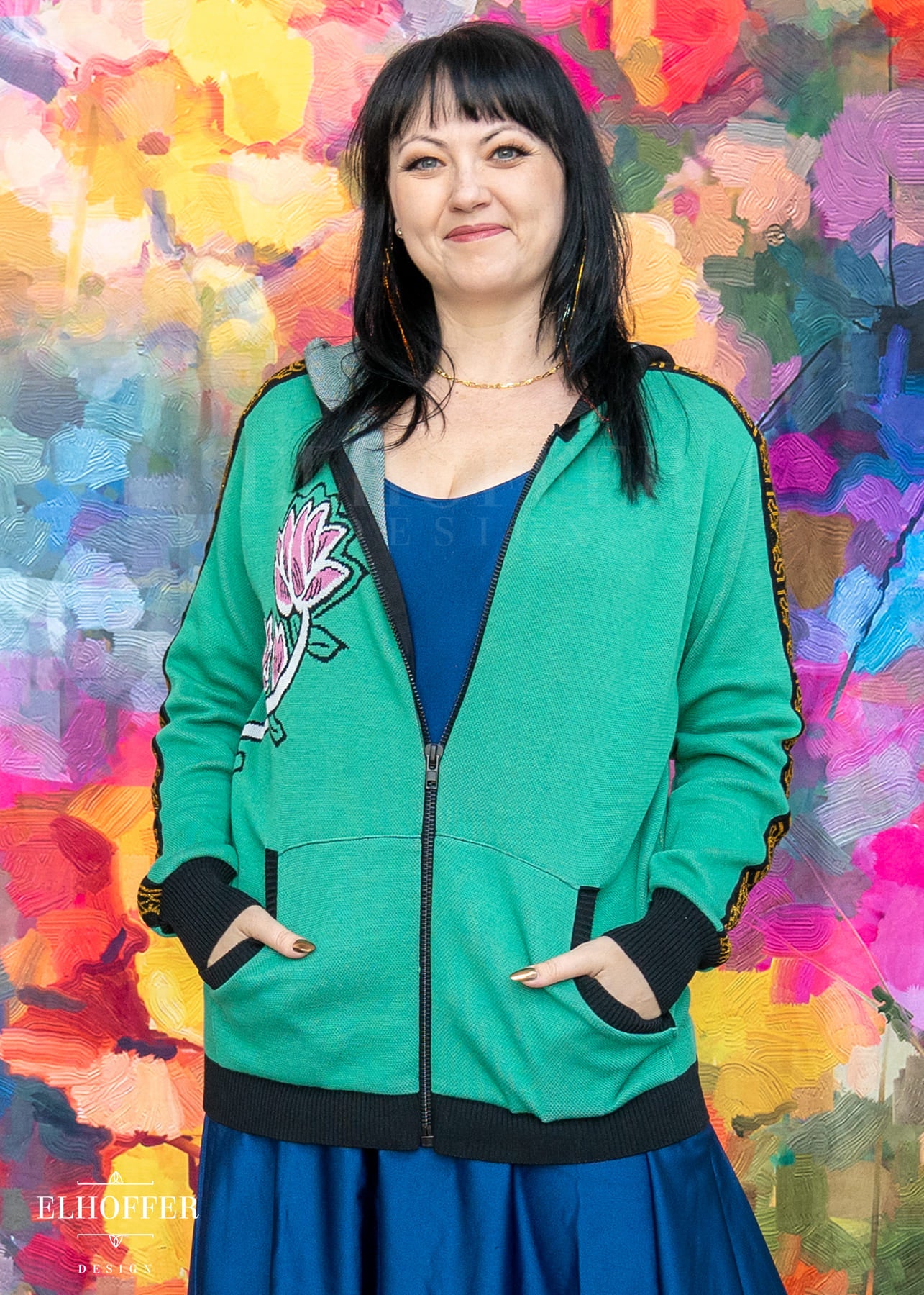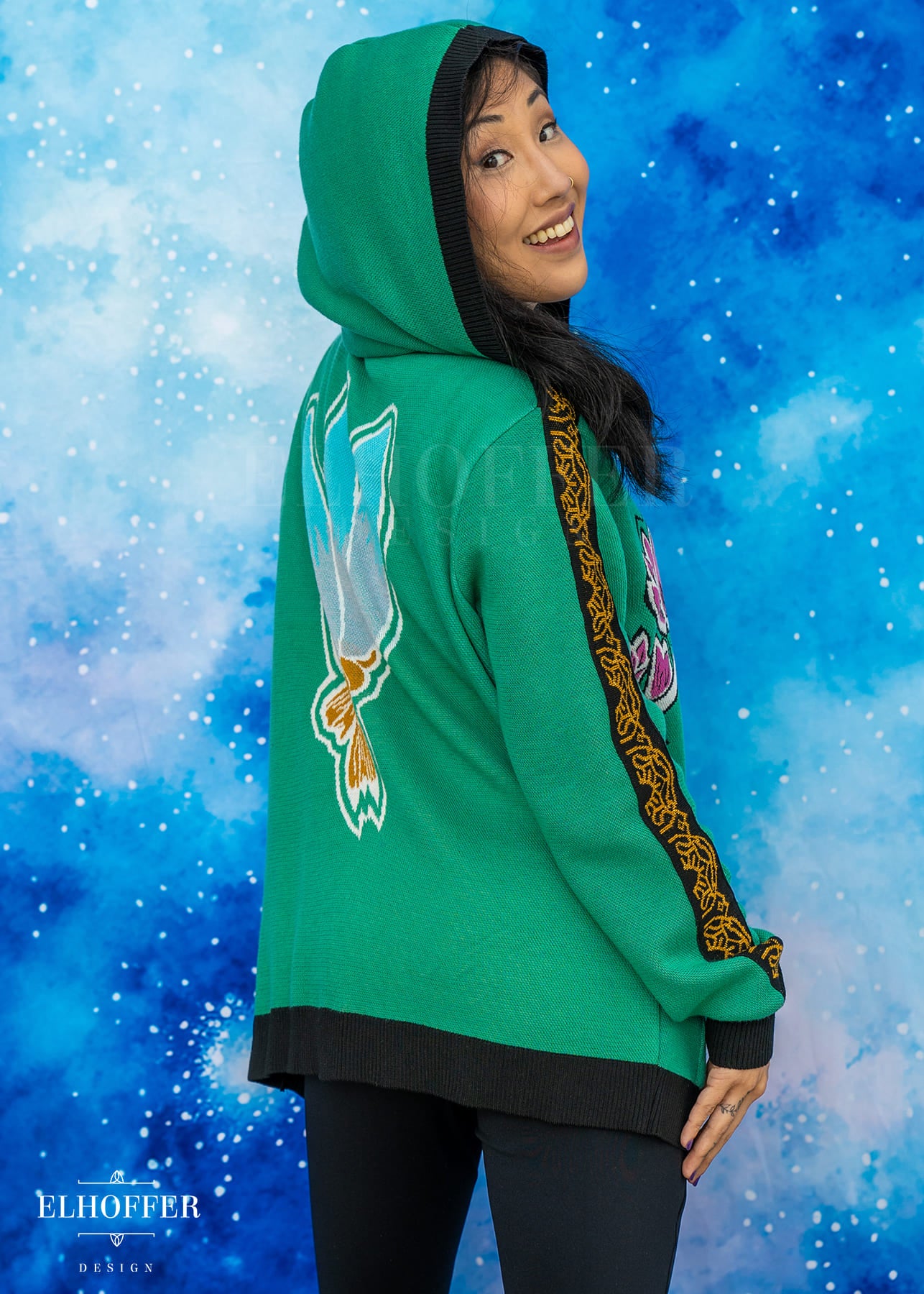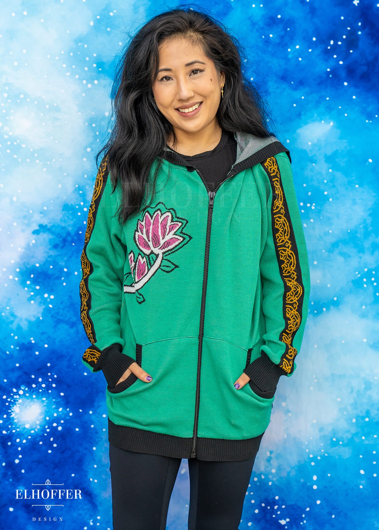 Our sample had the wrong shade of pink used in the flower, the final production will be a magenta instead of a light pink. And the wrong color at the base of shin-kal blades, sample is grey and we are changing it to light pink. We also are working on adding a yellow norigae knit art into the left pocket art.