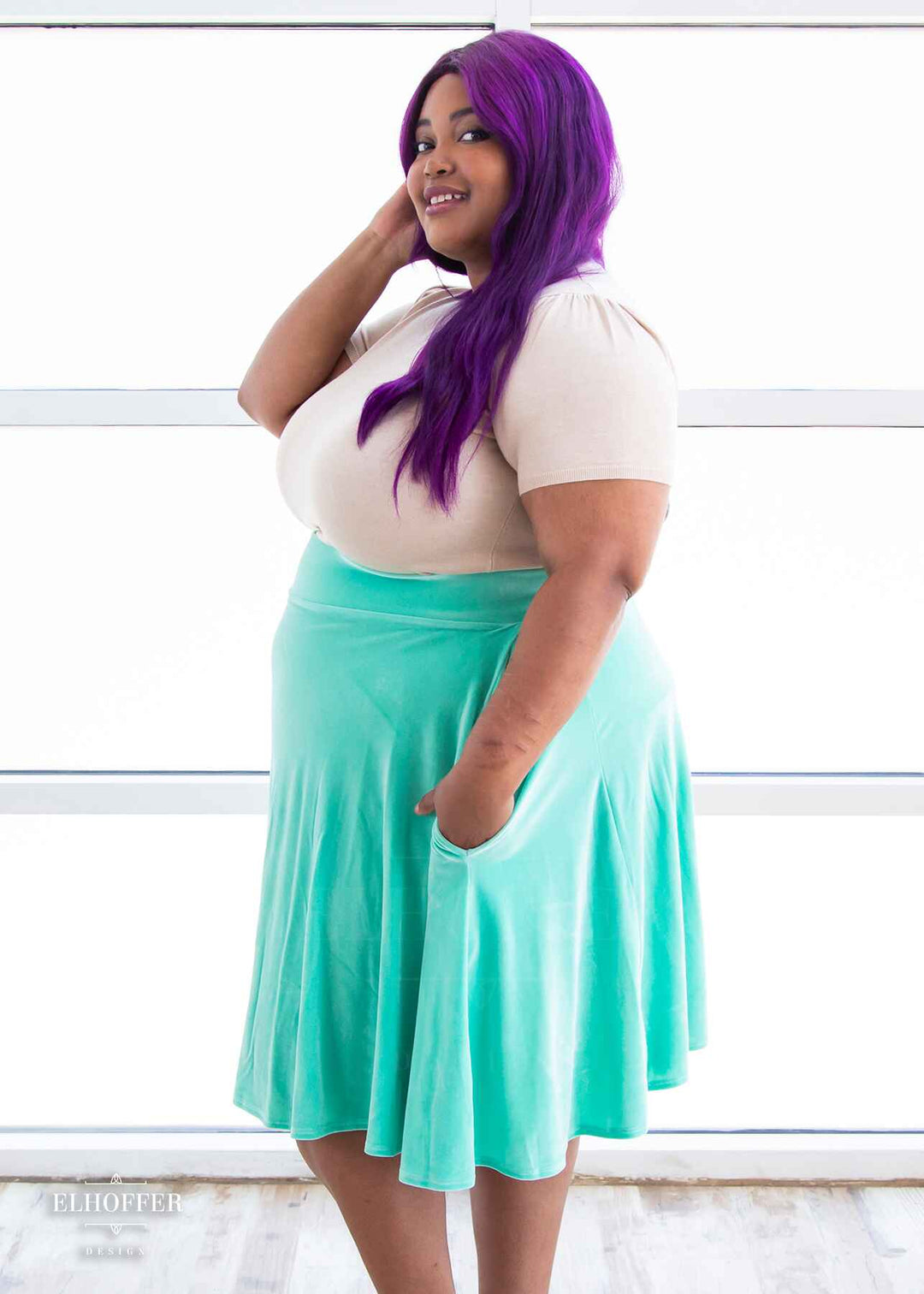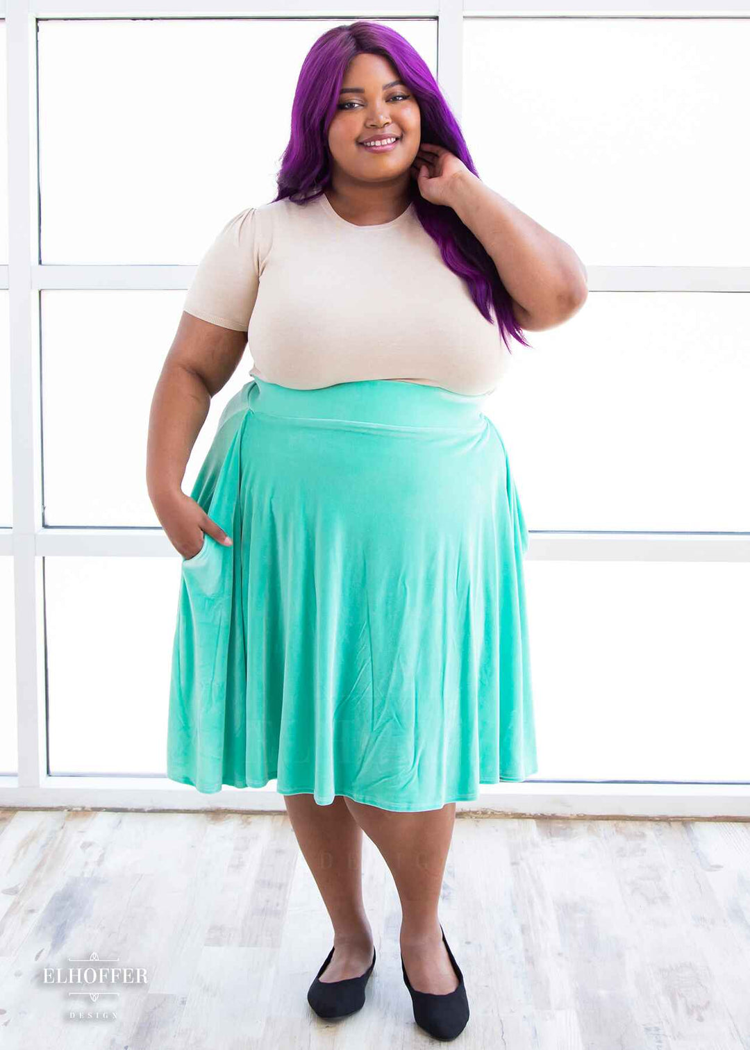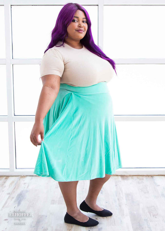 Based on our beloved Knee Length Dress, this skirt takes the bottom half of the dress, adds more volume to the skirt plus a high waisted elastic filled waistband, and is a comfy and sleek piece complete with pockets!