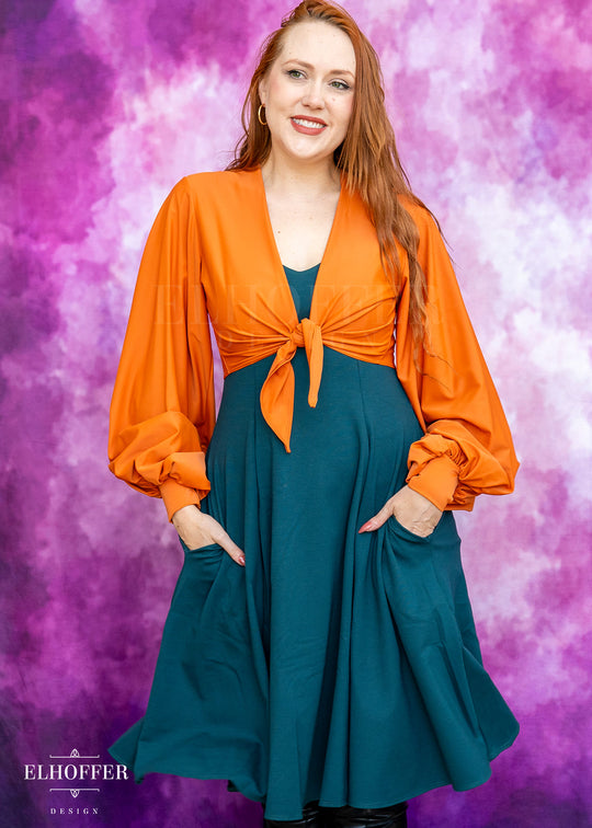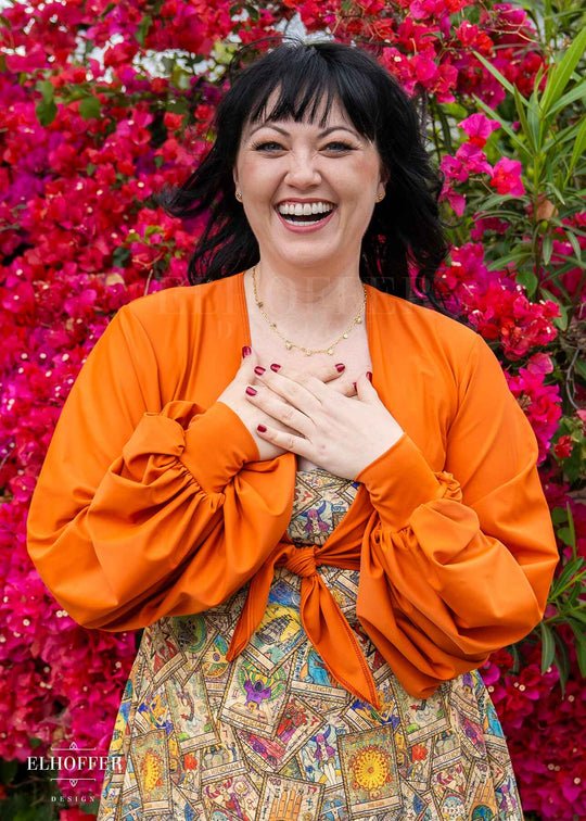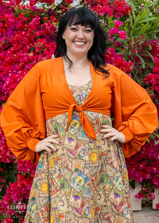 Add dramatic bishop sleeves to any look with this simple to layer top! It wraps in the front for a cute finish and could be worn over dresses or tops, or even just styled on its own for a sexy look with denim or  a skirt!