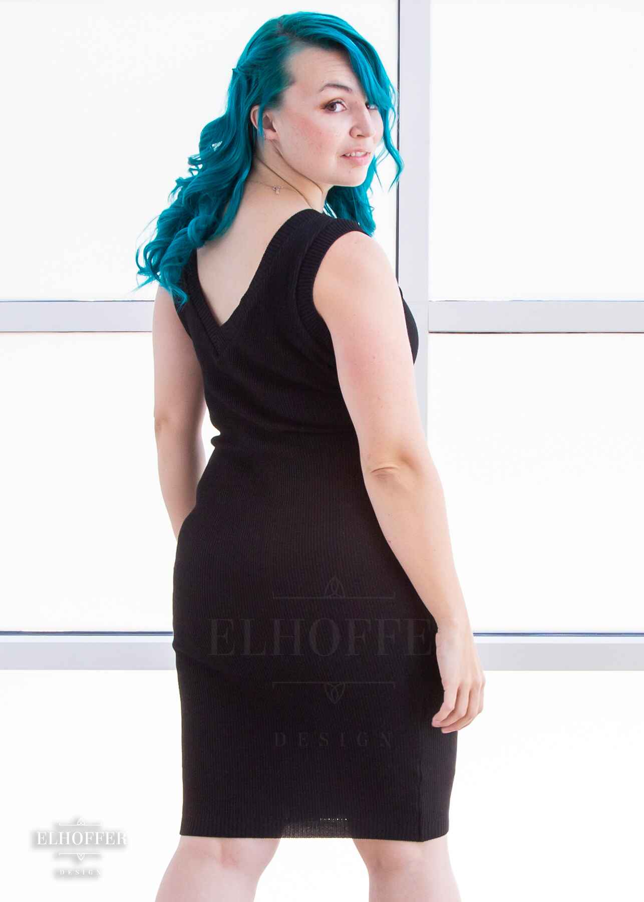• Sleeveless Fitted Knit Dress with a Deep V Neck and Reversible Boat Neck