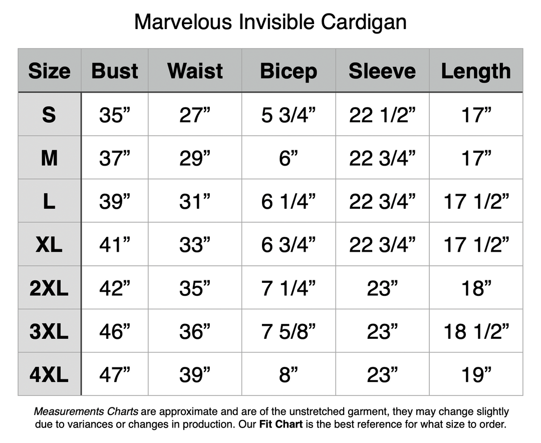Marvelous Invisible Cardigan. S - 35” Bust, 27” Waist, 5.75” Bicep, 22.5” Sleeve, 17” Length. M - 37” Bust, 29” Waist, 6” Bicep, 22.75” Sleeve, 17” Length. L - 39” Bust, 31” Waist, 6.25” Bicep, 22.75” Sleeve, 17.5” Length. XL - 41” Bust, 33” Waist, 6.75” Bicep, 22.5” Sleeve, 17.5” Length. 2XL - 42” Bust, 35” Waist, 7.25” Bicep, 23” Sleeve, 18” Length. 3XL - 46” Bust, 36” Waist, 7.62” Bicep, 23” Sleeve, 18.5” Length. 4XL - 47” Bust, 39” Waist, 8” Bicep, 23” Sleeve, 19” Length.