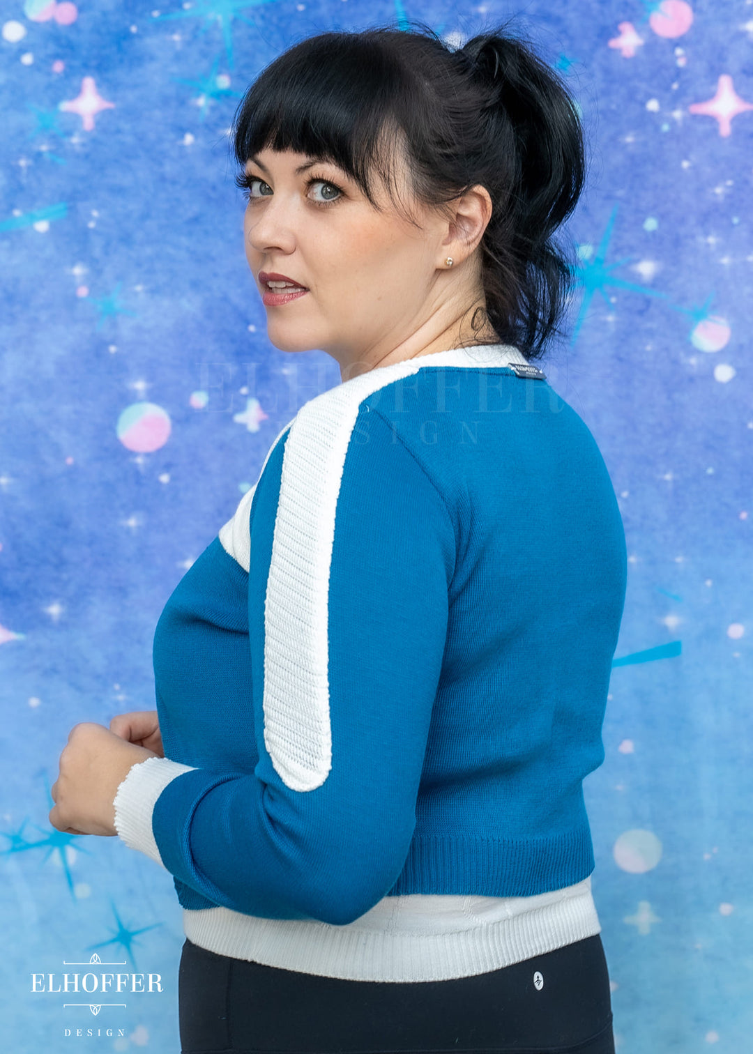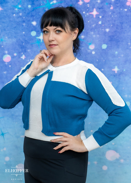 We can't promise you'll turn invisible in this cardigan, in fact you'll likely turn eyes and get all the attention in this gorgeous blue and white knit top. With the single button at the neck the fit is loose and perfect over a dress.